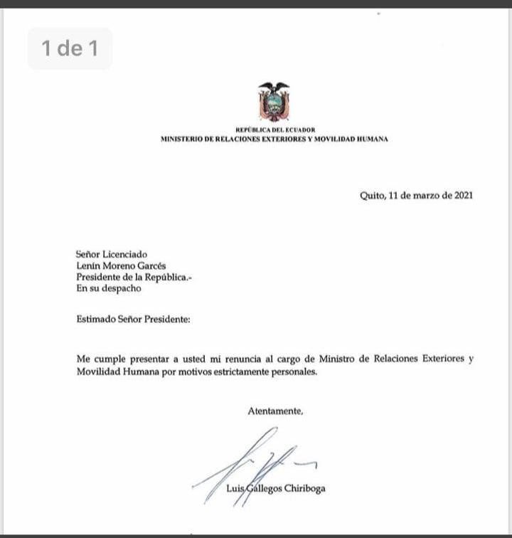 Fuentes de la Cancillería afirmaron que, la tarde de hoy, Gallegos tenía varias reuniones planificadas y que fueron canceladas. Luego circuló en las redes sociales una carta con la firma de Gallegos en la que presentaba su renuncia al presidente Lenín Moreno, por motivos personales.