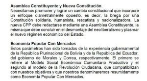 El plan de gobierno del candidato de Perú Libre parte por cuestionar la Constitución de 1993 y plantear la promoción de una asamblea constituyente encargada de redactar una nueva Carta Magna “solidaria, humanista, rescatista y nacionalizadora”, plasmando un “nuevo régimen económico del Estado”.