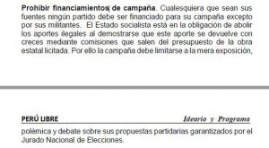 Aunque lo incluye en el rubro de política anticorrupción, Perú Libre hace una propuesta que, reconoce, tiene implicancias constitucionales: “Prohibir financiamientos de campaña. Cualesquiera que sean sus fuentes, ningún partido debe ser financiado para su campaña excepto por sus militantes”.