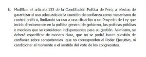La candidata presidencial de Fuerza Popular, Keiko Fujimori, apunta principalmente a modificaciones a la Constitución. Una de ellas se refiere al artículo 133, que establece que el presidente del Consejo de Ministros puede plantear ante el Parlamento una cuestión de confianza a nombre del consejo, y que “si la confianza le es rehusada, o si es censurado, o si renuncia o es removido por el presidente de la República, se produce la crisis total del gabinete”. Lo que busca Fujimori es delimitar el uso de dicha potestad del Ejecutivo.