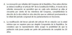 Fuerza Popular también propone que el Parlamento sea renovado a la mitad de su período en un 50%, para lo cual plantea modificar el artículo 90 de la Constitución. Este señala que el Poder Legislativo consta de una sola cámara, se elige cada cinco años y que la edad mínima para ser electo es de 25 años.