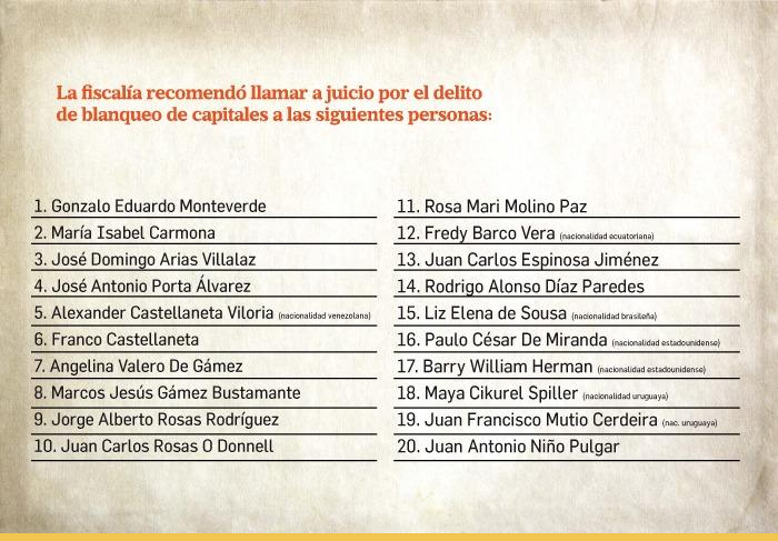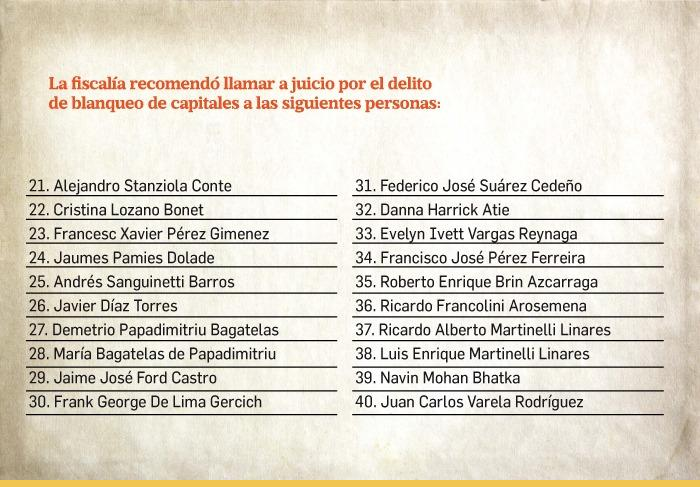 La Estrella de Panamá tuvo acceso a una de las últimas, de las casi mil fojas que componen la vista fiscal, en la que se detallan los nombres de quienes deben comparecer ante los tribunales para rebatir la teoría del caso de la Fiscalía Especial Anticorrupción. La vista fiscal es el relato de la fiscalía que describe con detalle los hechos que motivaron a las autoridades a solicitar juicio para este grupo de personas, entre las que hay 6 extranjeros y 44 nacionales, quienes supuestamente participaron en ocultar el dinero producto de dádivas pagadas por la constructora brasileña, o en corromper a funcionarios.