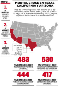Humane Borders alertó la situación de Arizona, luego que en 2020 sus equipos en el terreno registraran el hallazgo de los restos de 227 migrantes, mientras que al menos 7,000 han muerto a lo largo de la frontera entre Estados Unidos y México desde 1998.