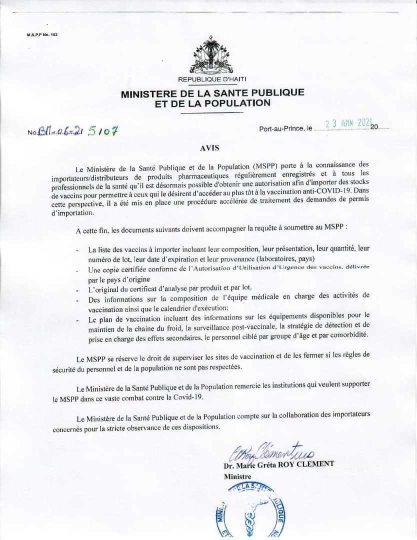 Dans un avis publié le mercredi 23 juin 2021, le ministère de la Santé publique et de la Population ouvre officiellement le processus de vaccination en Haïti en offrant aux importateurs/distributeurs de produits pharmaceutiques en Haïti l’opportunité d’importer des vaccins contre la Covid-19.