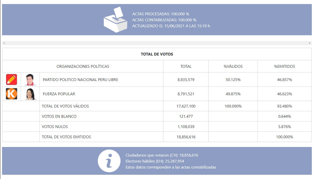 La Oficina Nacional de Procesos Electorales (ONPE) publicó una nueva actualización al 100% de actas procesadas y al 100% de actas contabilizadas. El candidato de Perú Libre, Pedro Castillo, tiene un total de 50.125% de votos a su favor, mientras que Keiko Fujimori, de Fuerza Popular, tiene 49.875%.