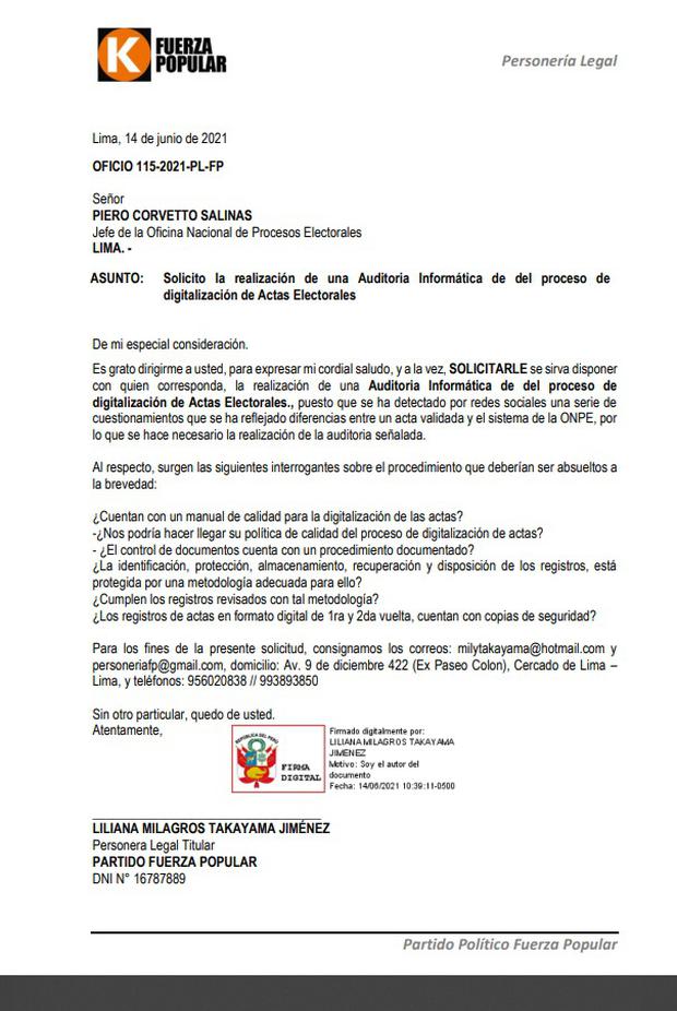 “Es grato dirigirme a usted para expresar mi cordial saludo y a la vez, solicitarle se sirva disponer con quien corresponda, la realización de una auditoría informática del proceso de digitalización de actas electorales, puesto que se ha detectado por redes sociales una serie de cuestionamientos que se ha reflejado [en] diferencias entre un acta validada y el sistema de la ONPE, por lo que se hace necesario la realización de la auditoría señalada”, refiere el documento.