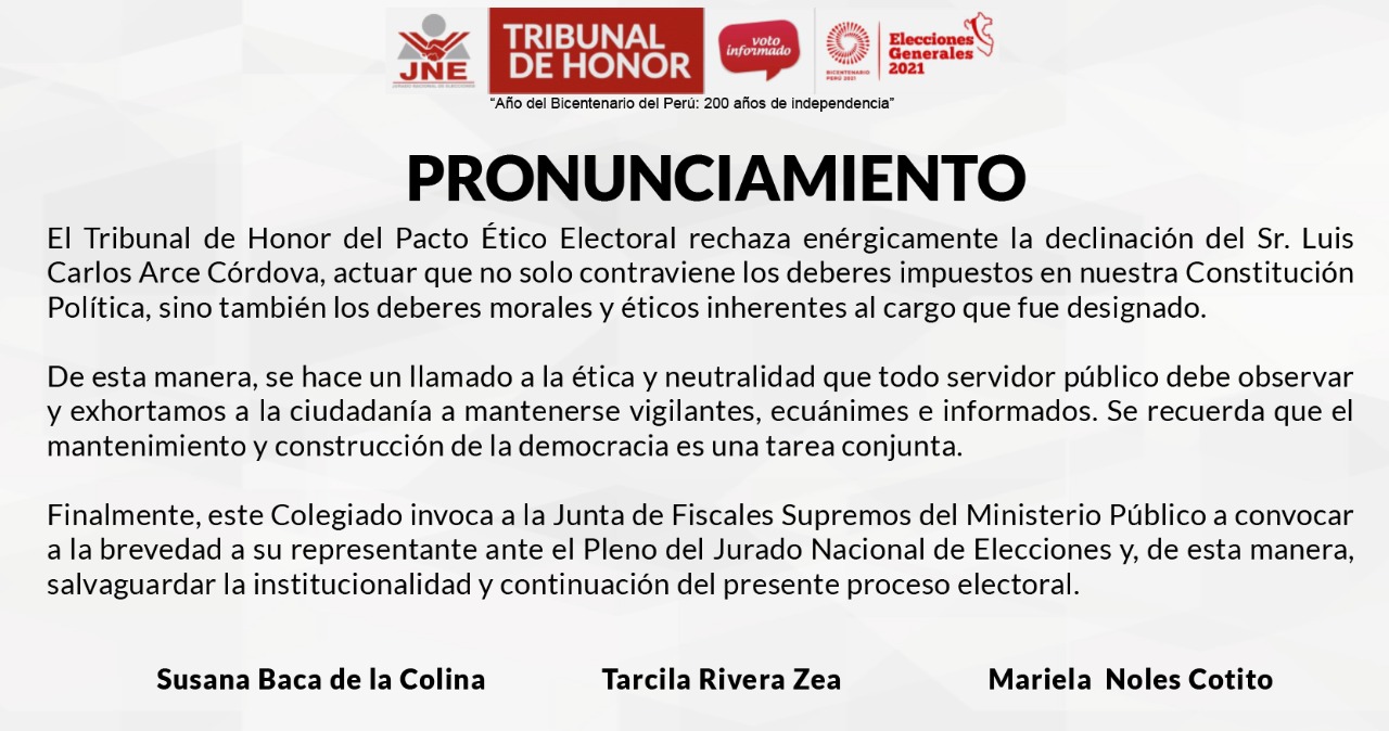 El Tribunal de Honor del Pacto Ético Electoral rechaza enérgicamente la declinación del Sr. Luis Carlos Arce Córdova