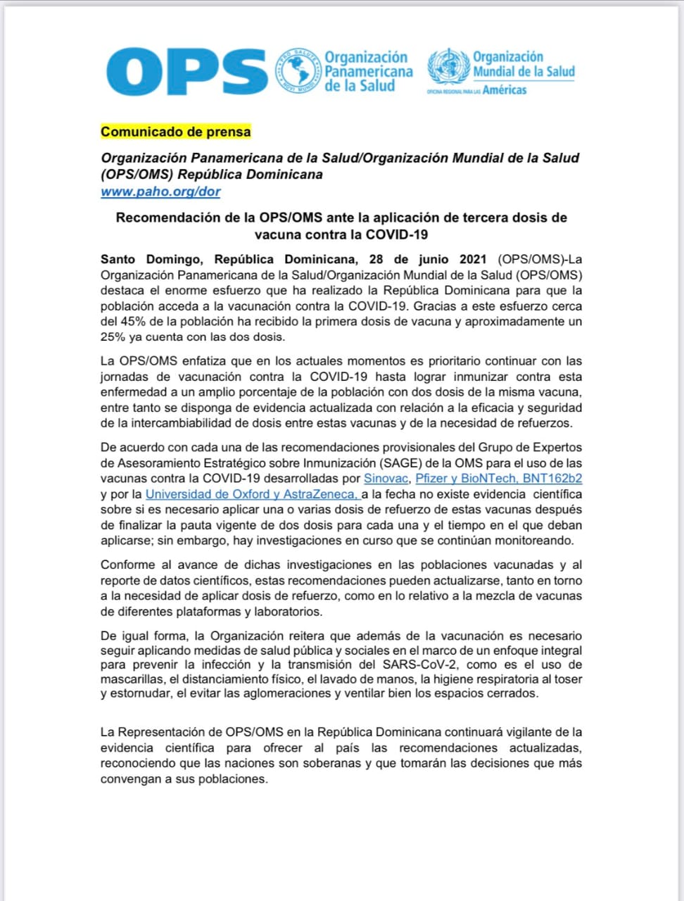 La posición de la OPS/OMS llega minutos antes de la reunión del Gabinete de Salud y de que el presidente Luis Abinader afirmara que hay estudios científicos que avalan la necesidad de una tercera porción.