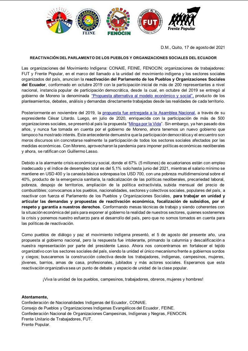 Ecuador | Organizaciones indígenas, sindicales y sociales reactivan el Parlamento de los Pueblos