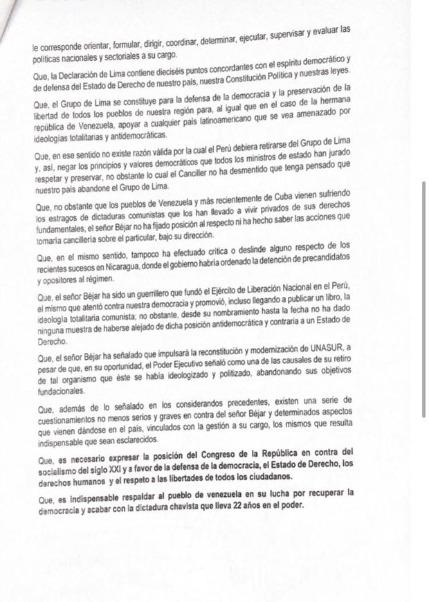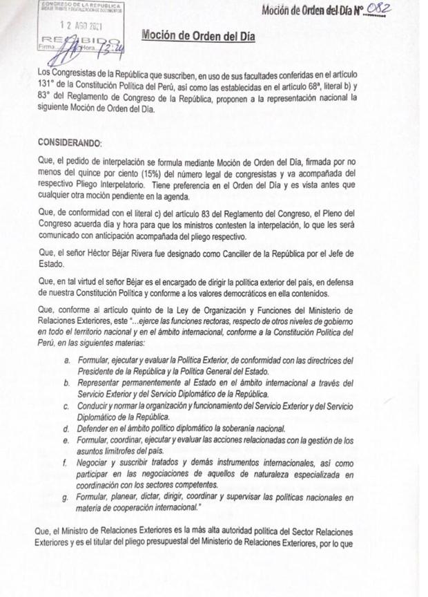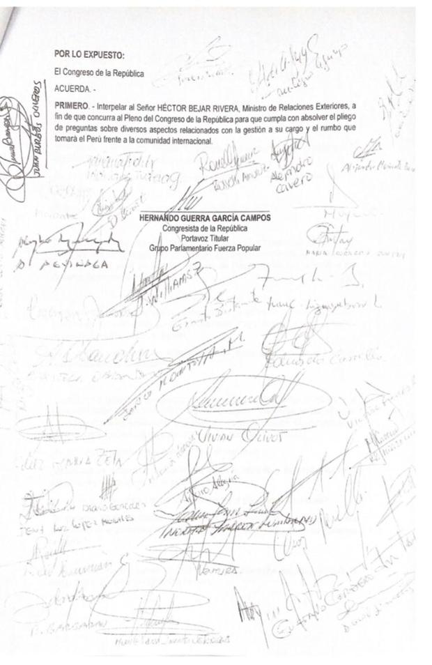 “Se acuerda interpelar al señor Héctor Béjar Rivera, ministro de Relaciones Exteriores, a fin de que concurra al pleno del Congreso de la República para que cumpla con absolver el pliego de preguntas sobre diversos aspectos relacionados con la gestión a su cargo y el rumbo que tomará el Perú frente a la comunidad internacional”, apunta el documento.