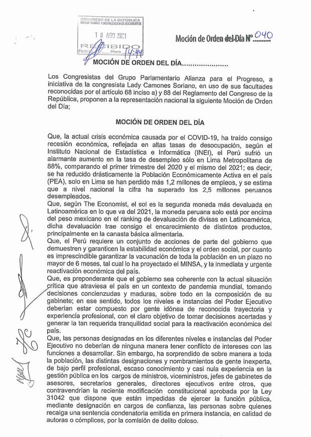 “Es preponderante que el Gobierno sea coherente con la actual situación crítica que atraviesa el país en un contexto de pandemia mundial, tomando decisiones concienzudas y maduras, sobre todo en la composición de su Gabinete; en ese sentido, todos los niveles e instancias del Poder Ejecutivo deberían estar compuestos por gente idónea de reconocida trayectoria y experiencia profesional”, se alega en el sustento de la moción.