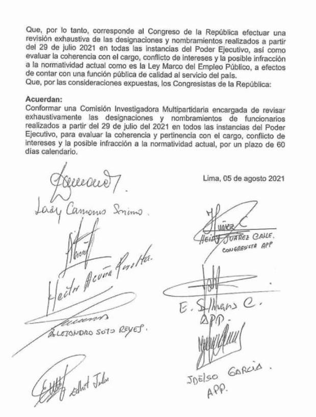 “Conformar una comisión investigadora multipartidaria encargada de revisar exhaustivamente las designaciones y nombramiento de funcionarios realizados a partir del 29 de julio del 2021 en todas las instancias del Poder Ejecutivo”, se indica en el documento.