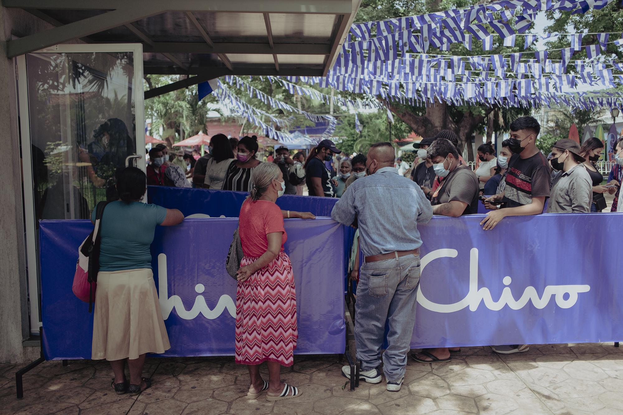Pasadas las tres de la tarde, llega una maestra llamada Irma, de 52 años, y su hija. Ellas intentan sacar en dólares el dinero del bono de $30, pero no pueden. “Ayúdenos aquí”, le pide la docente al empleado de Chivo. “El dinero del bono no se puede sacar, pero se puede ir a comprar en tiendas y supermercados”, le responde el empleado del cajero.