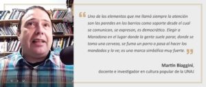 El sociólogo y ensayista Pablo Alabarces, el periodista Alejandro Wall y el docente e investigador en cultura popular Martín Biaggini, analizan al Maradona mito, leyenda que se construyó estando vivo y llevó a que, luego de su muerte, sea la figura repetida en los muros de los barrios populares. “Cuando hablamos de barrio, no me refiero a una cuestión geográfica sino a una cuestión simbólica: el barrio es la gente viviendo, cómo se relaciona, cómo produce simbolismo; no es un lugar que ocupa siete manzanas”, define Baggini, integrante del Programa de Estudios de la Cultura de la Universidad Nacional Arturo Jauretche (UNAJ), y destaca que “uno de los elementos que me llamó siempre la atención son las paredes en los barrios como soporte desde el cual se comunican, se expresan, es democrático. Y esas paredes se usan para cuestiones muy particulares, desde políticas hasta artísticas, futboleras y religiosas. Elegir a Maradona en el lugar donde la gente suele parar, donde se toma una cerveza, se fuma un porro o pasa al hacer los mandados y lo ve; es una marca simbólica muy fuerte”.