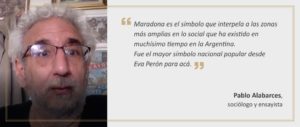 El titular del seminario Cultura Popular en la Facultad de Ciencias Sociales de la UBA coincide con Alejandro Wall al plantear que la figura de Maradona trascendió más allá de lo que fue como jugador y ese es el punto de partida: “su legitimidad nace en su condición de jugador; no se levanta en torno a él un relato sino que él es el relato y se construye sobre dos elementos: una emotividad potentísima y un cuerpo real”. En cuanto al primer elemento, Alabarces considera que “Maradona está cargado de afectividad, de emotividad por el tipo de lazo que la sociedad entabló con él: se lo amaba o se lo odiaba, no era que te caía bien”. Y hace énfasis en el segundo elemento: “esto es decisivo: fue el mejor jugador de fútbol del mundo; durante 20 años hizo las cosas más increíbles que se hayan visto, entre muchas otras hazañas, (Héctor) Enrique le da un pase 10 metros antes del mediocampo y ese cuerpo es el que gira y empieza a gambetear a ingleses un día preciso de julio de 1986, cuatro años después de la guerra de Malvinas, y lo hizo un cuerpo real, concreto. Entonces cada vez que aparecía, más entero, menos entero, más derecho, menos derecho, más gordo, más flaco, con él aparecía toda la historia”.