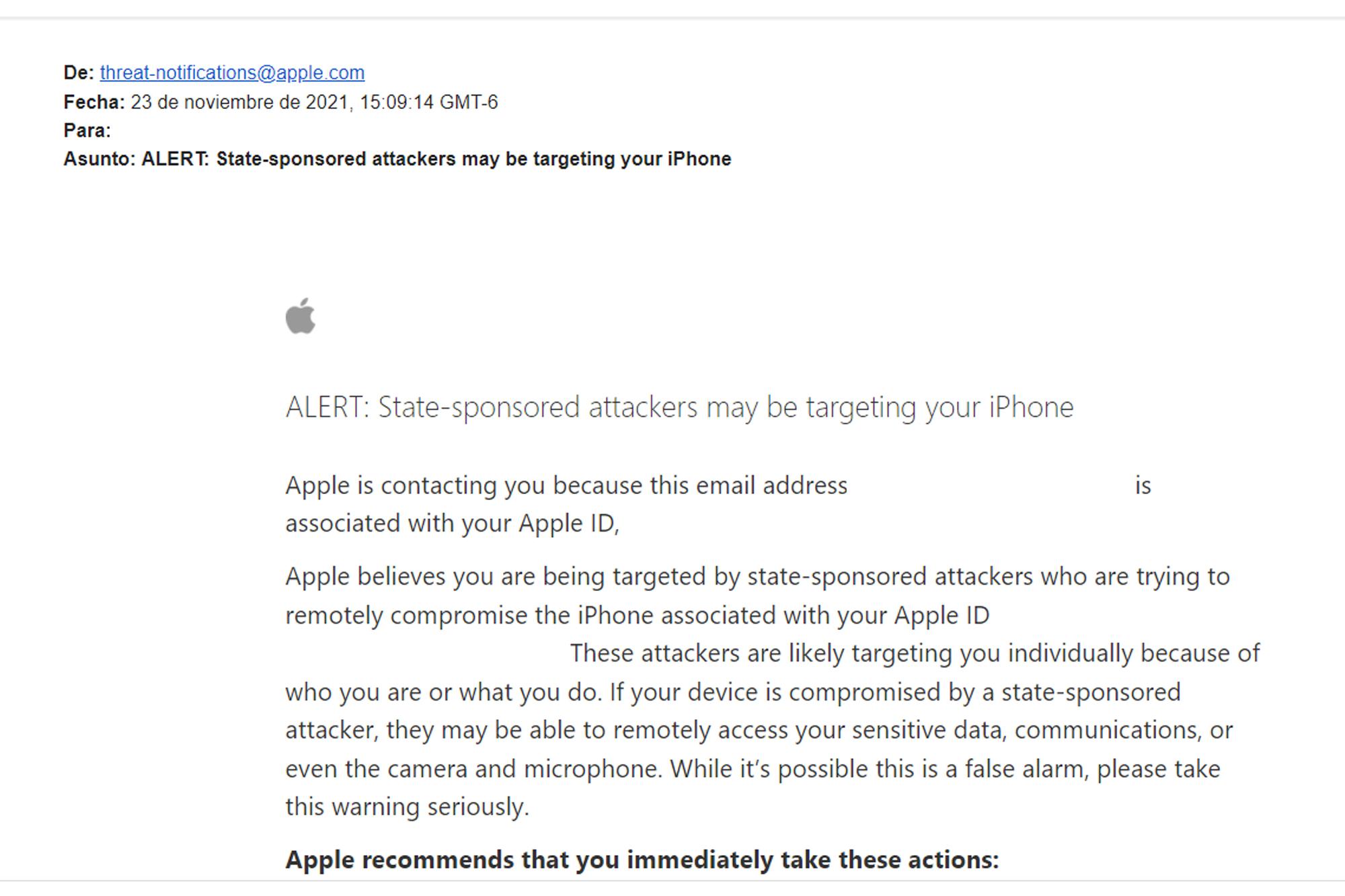 Según se lee al inicio de un correo -recibido por un periodista de El Faro-, “Apple envió una alerta de seguridad urgente a las direcciones de correo electrónico y al número de teléfono principal asociado con esa ID de Apple”. Agrega en todos los correos: «Es probable que estos atacantes lo estén atacando individualmente debido a quién es usted o qué hace. Si su dispositivo se ve comprometido por un atacante patrocinado por el Estado, es posible que pueda acceder de forma remota a sus datos confidenciales, comunicaciones o incluso a la cámara y el micrófono». Líneas después, Apple advierte: «Si bien es posible que se trate de una falsa alarma, tómese esta advertencia en serio».
