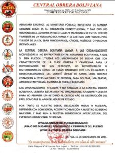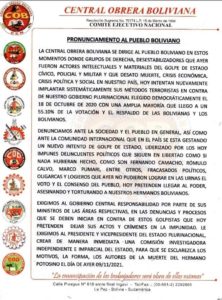 Mediante un pronunciamiento dirigido al pueblo boliviano, la COB llama a sus organizaciones afiliadas y no afiliadas a organizarse y no permitir un retorno a la destrucción que causó el golpe de Estado de 2019,