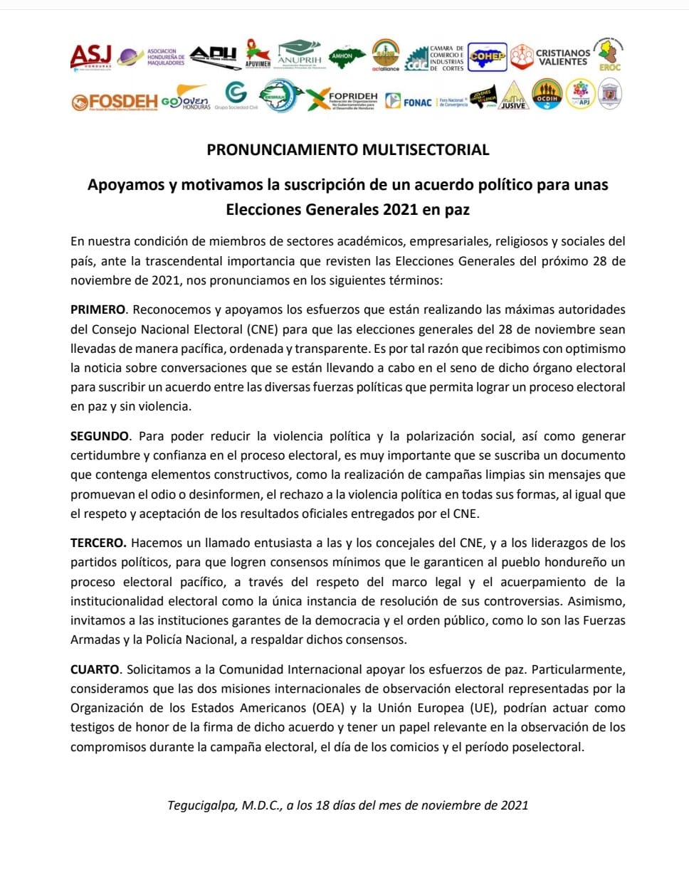 Más de 22 organizaciones de sociedad civil, miembros del sector académico, empresariales y religiosos, este jueves emitieron un pronunciamiento multisectorial donde piden el desarrollo de unas elecciones generales del próximo 28 de noviembre en paz y sin violencia política.