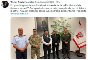 Acompañó la publicación de una foto junto a las máximas autoridades de las Fuerzas Armadas: el comandante general de la FAP, Alfonso Javier Artadi Saletti; el comandante general de la Marina, Alberto Alcalá Luna; el comandante general del Ejército, Walter Horacio Córdova Alemán; y el jefe del Comando Conjunto de las Fuerzas Armadas, Manuel Gómez de la Torre.