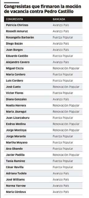 Alianza para el Progreso (APP) y Acción Popular (AP) se pronunciaron la semana pasada en contra de destituir a Castillo. El vocero alterno de AP, José Arriola, recalcó a La República que se mantienen en su postura. Lo mismo en APP. El líder, César Acuña, así lo ha ordenado. No obstante, en esa bancada siempre están los votos discordantes de Gladys Echaíz y Roberto Chiabra, quienes aún no responden si acatarán. Si ambos se sumaran al esfuerzo destituyente, faltarían 7 votos. No es una cantidad inalcanzable.