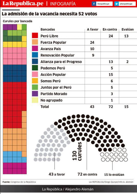 A las 11:38 de la mañana, con las firmas de 28 congresistas, se presentó ante la Mesa de Partes la anunciada moción de vacancia presidencial. Sin embargo, para que sea admitida a debate, se necesitan 52 votos. Si se consiguieran, Pedro Castillo solo dejaría el cargo si, como mínimo, 87 legisladores votan a favor de la iniciativa. Hoy ese escenario resulta improbable.