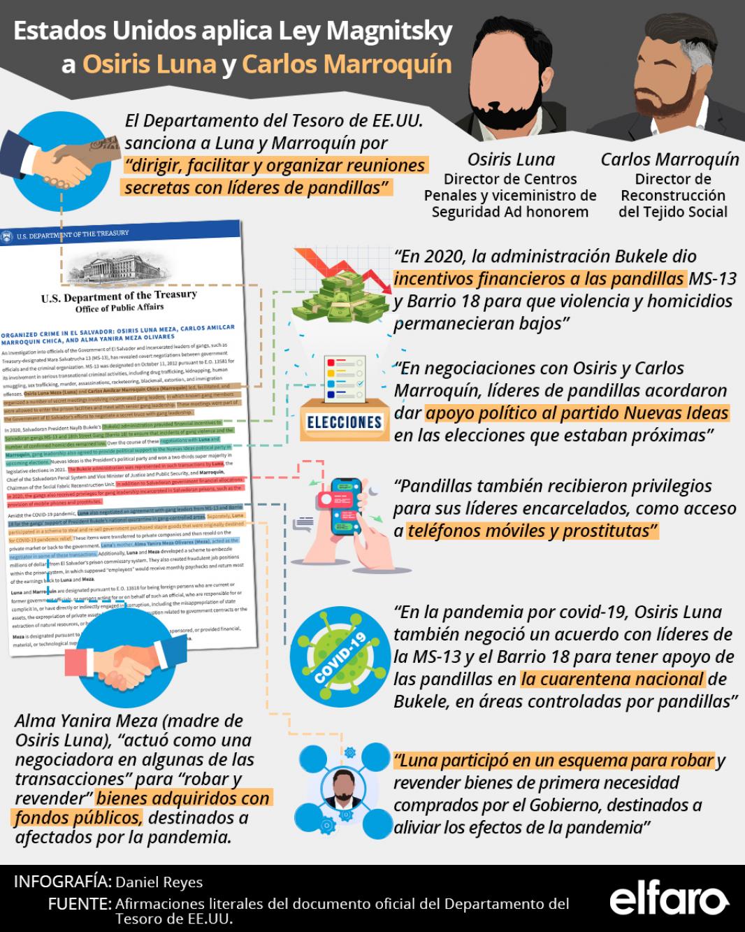 El departamento del Tesoro de Estados Unidos anunció este miércoles la aplicación de sanciones de la Ley Global Magnitsky al director de Centros Penales y Viceministro de Seguridad de El Salvador, Osiris Luna, y al encargado de la Dirección de Reconstrucción del Tejido Social, Carlos Marroquín, a quienes acusa de haber encabezado durante 2020 un proceso de negociaciones secretas con las pandillas Mara Salvatrucha (MS-13) y Barrio 18, con el fin de que estas redujeran el número de homicidios a cambio de “incentivos económicos” y beneficios carcelarios para sus líderes presos.