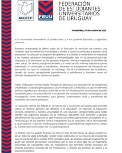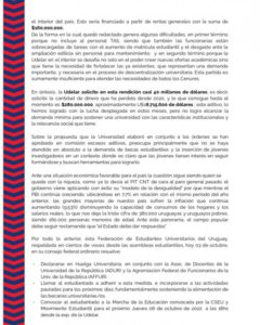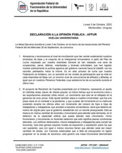 Desde La Izquierda Diario Uruguay apoyamos con todas nuestras fuerzas esta lucha de trabajadores y estudiantes, convocamos a respaldar y participar de todas las medidas de lucha que sostienen les compañeres. Compartimos con nuestros lectores algunos de los distintos comunicados y plataformas que han difundido los gremios y sindicatos.