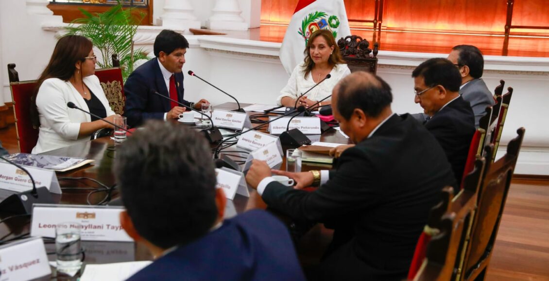 Junto a Alberto Otárola, la presidenta recibió al gobernador regional de Arequipa, Rohel Sánchez, y a la gobernadora regional de Moquegua, Gilia Gutiérrez, directivos de la ANGR. Estaban acompañados de los rectores de la universidad La Molina, Américo Guevara, y de la UNI, Alfonso López Chau, directivos de la AUNAP.