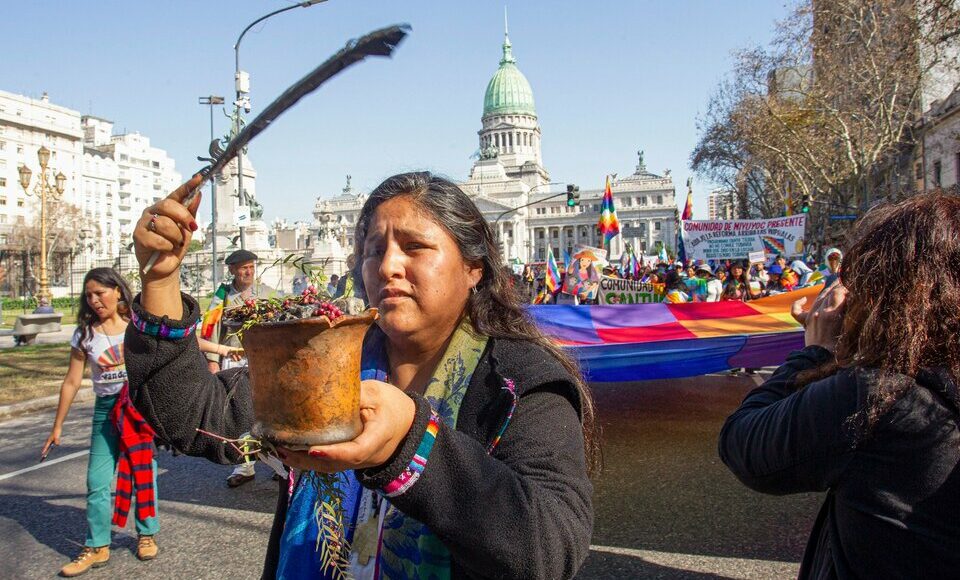 Para la mitad de las cosas que se vieron en la marcha, a los rioplatenses nos faltan las palabras. Otras ropas, otros ritos, otros instrumentos de música, gestos con significados que se escapan: una comunera colla hace fuego en un tiesto sobre el que quema unas ramas, esparce después el humo, que perfuma la calle. “Eso que quema es molle (lo que aquí llamaríamos ramas de pimienta), ella está haciendo una sahumada para tirar buenas energías y pedir a la Pachamama lo que se necesita”, explica Graciela, también integrante del Malón, habitante de una comunidad de Abra Pampa.