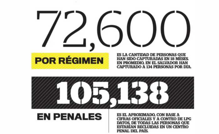 Según cifras oficiales, las autoridades han capturado hasta la fecha a 72,600 personas, sin embargo, ninguno de estos ha sido condenado, a pesar que la población se ha triplicado hasta un total de 100,000, «más o menos», dijo Villatoro. La cantidad de personas en el sistema penitenciario, antes de marzo de 2022 ya rondaba los 40,000 detenidos.