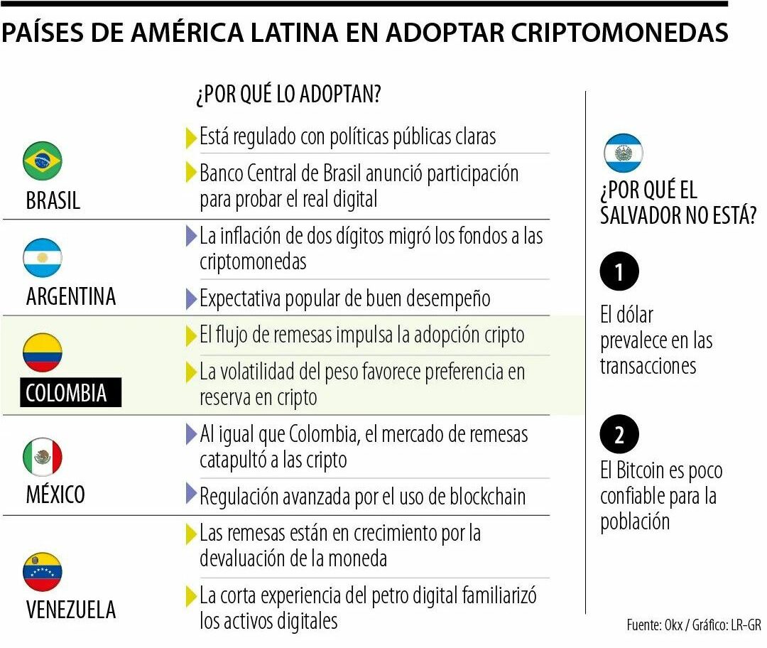 Según el portal especializado en cripto Okx, Brasil lidera la adopción en la región, principalmente por poseer el mayor PIB y mercado de consumo, junto a una avanzada regulación de tecnología blockchain. Este país es pionero en el favorecimiento de una regulación fértil para las criptos, que indica una autorización de las entidades públicas, con una alta participación del Banco Central de Brasil en la prueba del real digital.