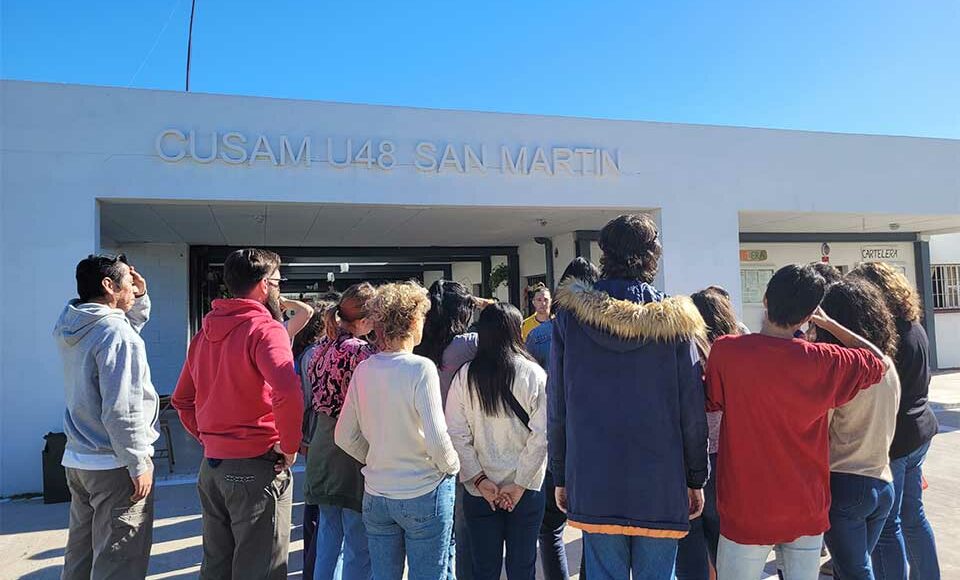 La actividad en el Centro Educativo San Martín (CUSAM), ubicado en la Unidad Penal N° 48 del Servicio Penitenciario Bonaerense (José León Suárez), estuvo compuesta por un primer acercamiento al taller Cuerpo y palabra, el cual será ofrecido en el Centro, desde el 8 de mayo, por docentes y estudiantes de Artes del Movimiento y Crítica de Artes. Asimismo, se llevó a cabo la performance participativa En tránsito por parte del Grupo de Experimentación en Artes del Movimiento (GEAM) a cargo de su nueva directora, Valeria Martínez.